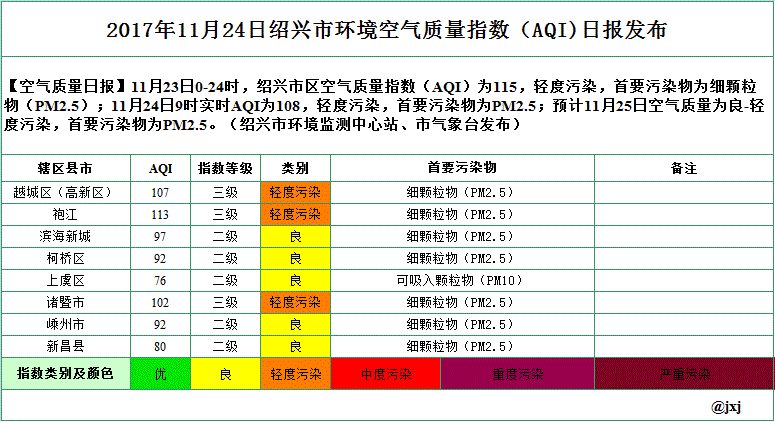 2016年11月24日绍兴市区环境空气质量指数(AQI)日报发布