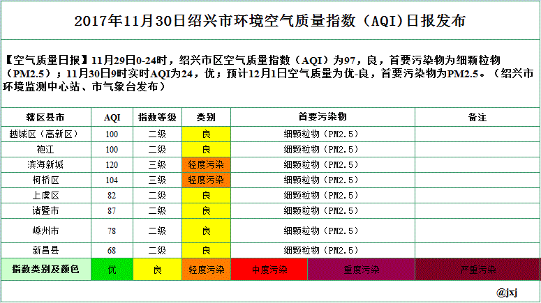 2017年11月30日绍兴市环境空气质量指数(AQI)日报发布