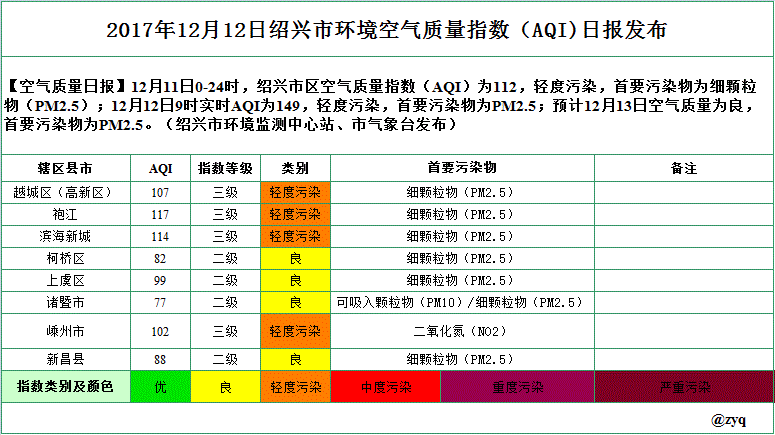 2017年12月12日绍兴市环境空气质量指数(AQI)日报发布