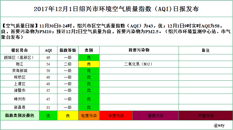 2017年12月1日绍兴市环境空气质量指数(AQI)日报发布