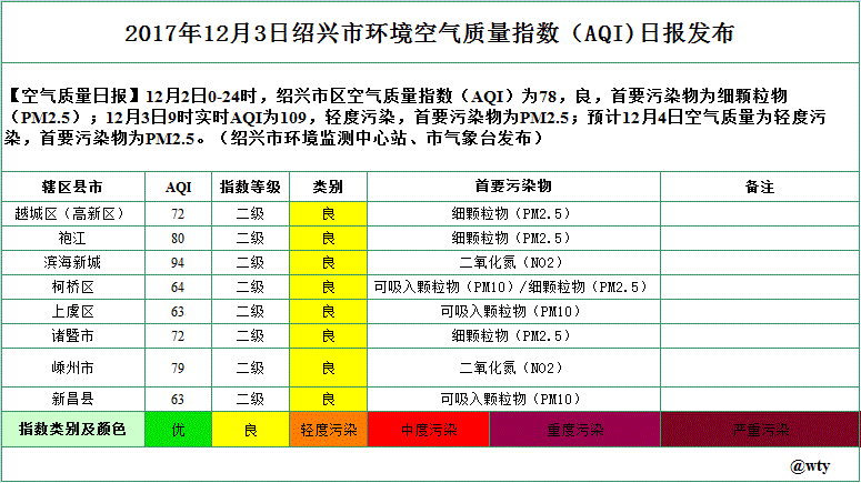 2017年12月3日绍兴市环境空气质量指数(AQI)日报发布