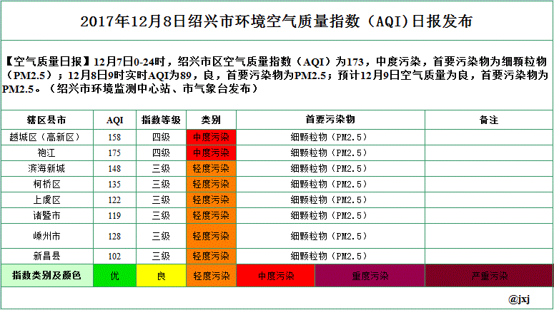 2017年12月8日绍兴市环境空气质量指数(AQI)日报发布