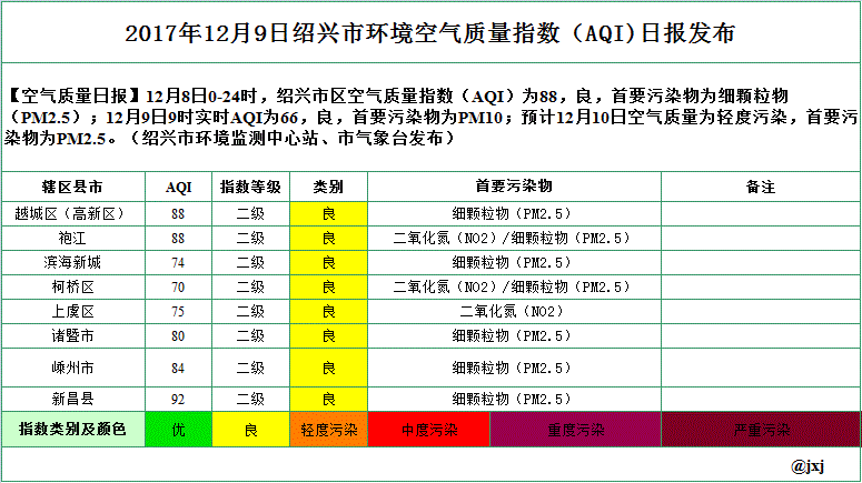 2017年12月9日绍兴市环境空气质量指数(AQI)日报发布