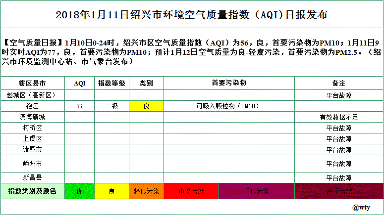 2018年1月11日绍兴市环境空气质量指数(AQI)日报发布