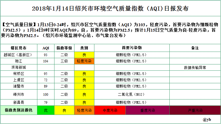 2018年1月14日绍兴市环境空气质量指数(AQI)日报发布