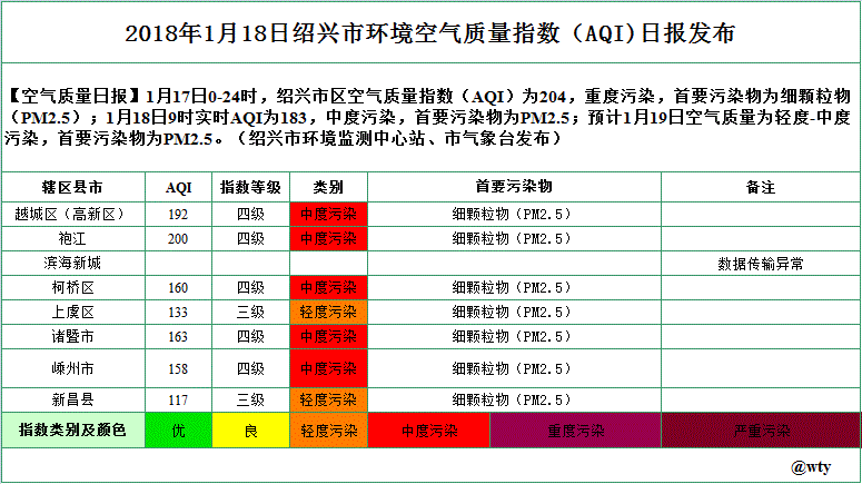 2018年1月18日绍兴市环境空气质量指数(AQI)日报发布