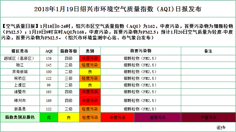2018年1月19日绍兴市环境空气质量指数(AQI)日报发布