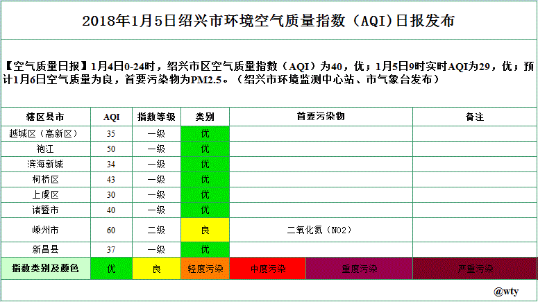 2018年1月5日绍兴市环境空气质量指数(AQI)日报发布