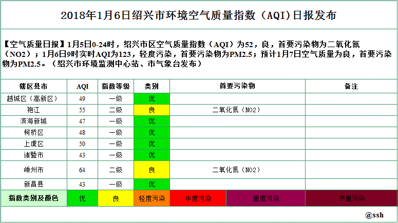 2018年1月6日绍兴市环境空气质量指数(AQI)日报发布