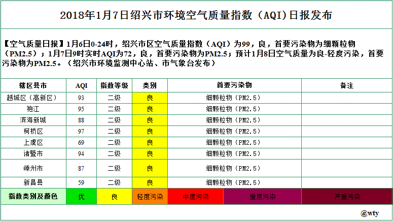 2018年1月7日绍兴市环境空气质量指数(AQI)日报发布