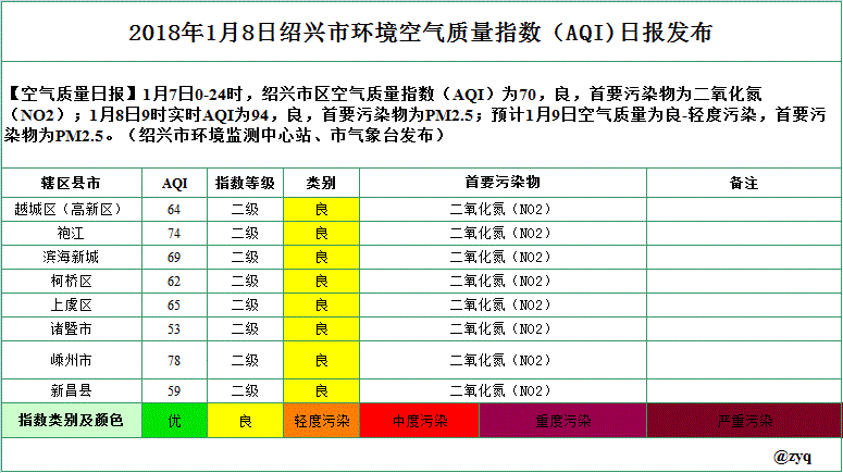 2018年1月8日绍兴市环境空气质量指数(AQI)日报发布